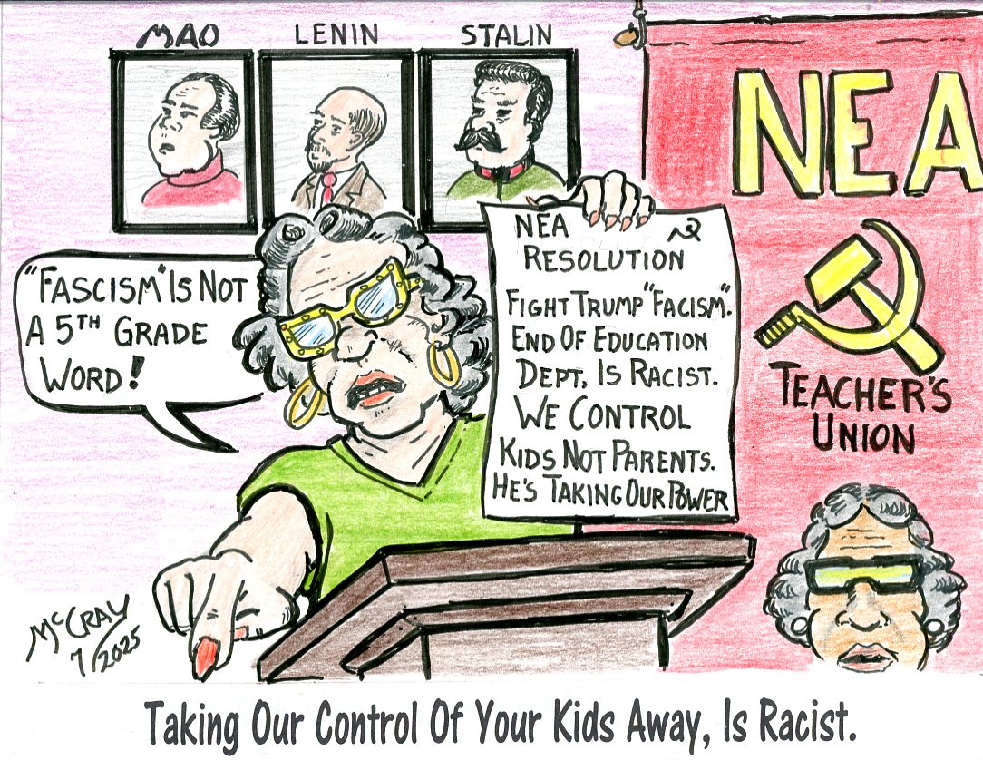 Finally, the National Educators Association Teachers' Union have dropped the pretense of concern for the students they are supposed to educate. The largest teachers' union in the U.S. has declared itself as a left-wing political organization. The NEA’s 2025 teacher of the year, Ashlie Crosson, announced that her job is “deeply political” at the 4th of July annual meeting in Portland, Oregon. She continued, “Once I realized how deeply political our profession had always been, I knew I could no longer stay on the sidelines.” Resolutions called for the teachers' union to fight President Trump’s “embrace of fascism,” by misspelling Fascism as ‘Facism.’ So much for spelling. They called the shutting down of the Department of Education an “Illegal, antidemocratic, and racist attempt to destroy public education and privatize it in the interest of the billionaires." The resolutions continued, to “defend birthright citizenship and oppose the attempt to revert to pre-civil rights movement – Jim Crow - legal concepts of ‘states' rights’ in order to deny citizenship to the children of immigrants.” Additionally, they called for supporting students' “right to dissent and organize against Trump’s policies,” as well as “against ICE raids and deportations.” The NEA has stepped outside the purpose of education of students and has moved into the indoctrination of students in socialist principles. The NEA also took exception to the recent Supreme Court ruling, giving parents control over their children. Parents have the right to pull their children out of “Gender Classes,” while the NEA made it clear they will continue to push that garbage in the schools. The NEA needs to be shut down, for they are a threat to all of the students they pretend to care about. This is the same indoctrination method used by Communist China and all other socialist countries. Their goal is to indoctrinate all students in the Communist Principles of Karl Marx, which will turn the children toward the state, and against their parents; this is the mental abuse of minors. Ref: Fox News, Teacher’s Union reveals true colors behind closed doors at annual convention, July 10, 2025, by Corey DeAngelis.